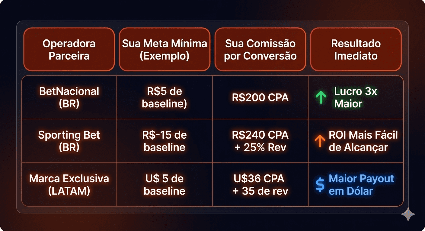 Cansado de CPAs baixos? Nossa estratégia é simples: menor exigência para você, maior comissão na sua conta. Você atrai jogadores, e eles precisam realizar uma ativação mínima (o Baseline, ex: R$-15). Essa meta é baixa para que você consiga alto volume de conversão. Resultado: Uma vez batido o Baseline, você recebe o CPA mais alto do mercado (R$200, R$240+) por cada jogador. É o caminho mais rápido para ver o seu ROI (Lucro) disparar